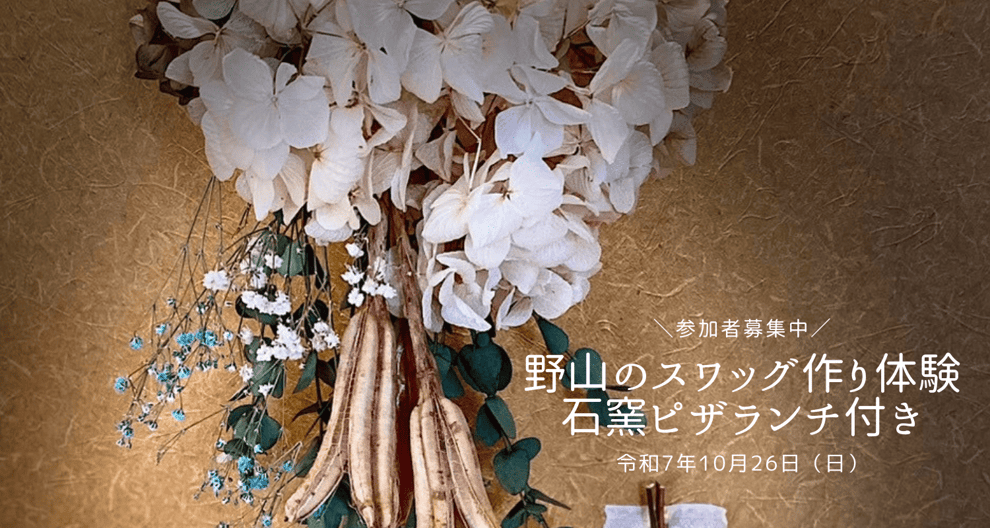 スワッグとは、花や葉、実などの植物を束ねて壁にかける飾りです。 野山を彩る植物を使って、オリジナルのスワッグを作りましょう😊 ✨ 誰でも簡単に素敵なスワッグを作ることができますよ♪ 石窯で焼いたあつあつの本格ピザランチ付き🙌 普段は貸切専用のキャンプ場で、秋の気持ちよい風を感じながらものづくりを楽しみましょう❣